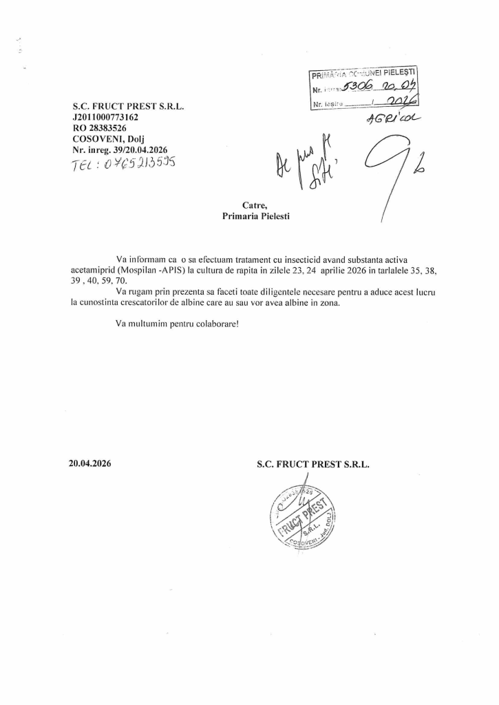 Anunt important privind efectuarea unui tratament cu insecticid la culturile de rapita in perioada 23 ,24.04.2026 20 apr. 2026 10 Distribuie