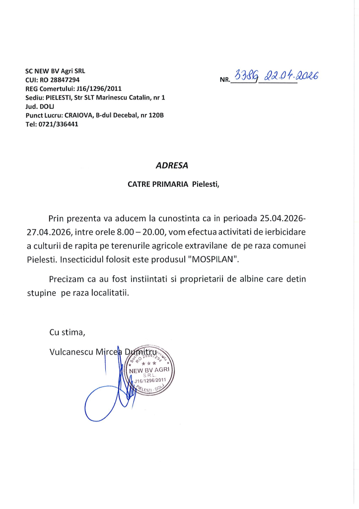 Anunt important privind efectuarea unui tratament cu insecticid la culturile de rapita in perioada 25 -27.04.2026 23 apr. 2026 11 Distribuie